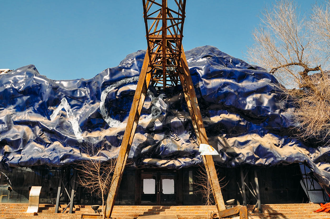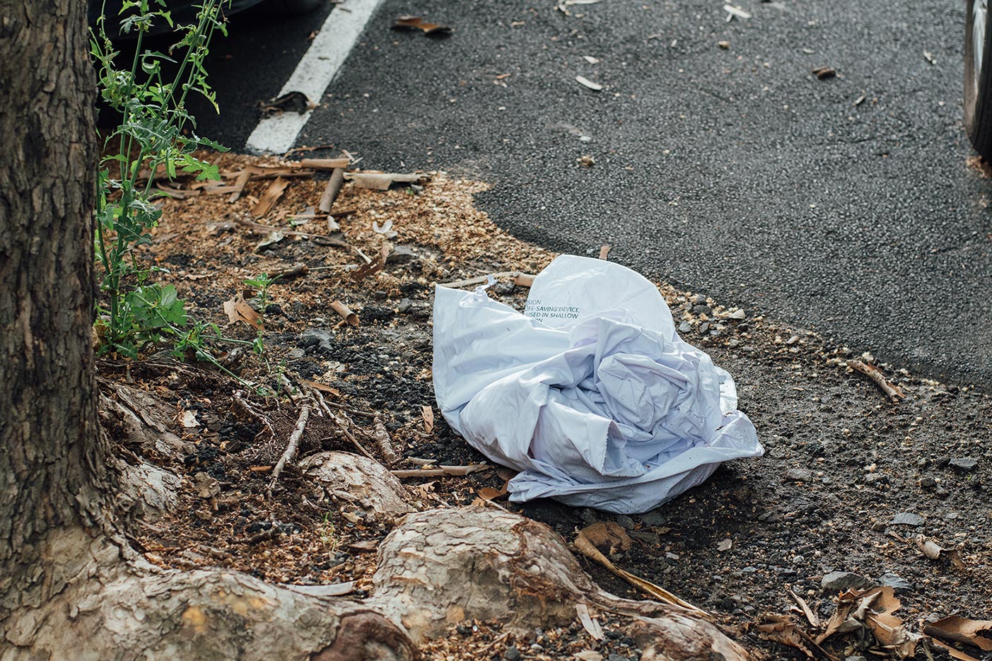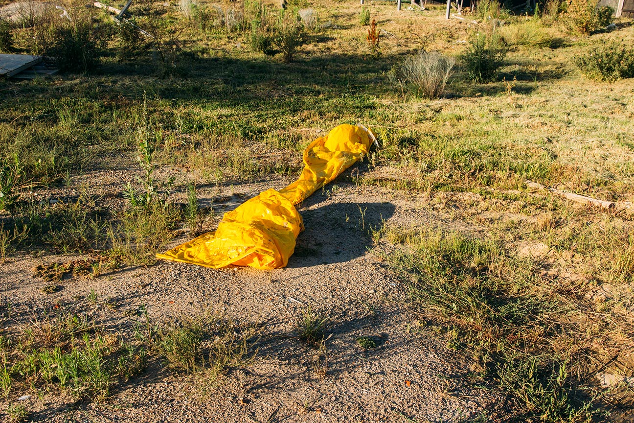 Stretched yellow plastic in empty lot.